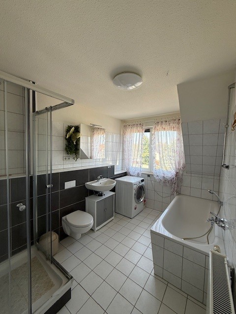 Die Bodenbelege sind eine Kombination aus Fliesen, Teppichböden und PVC, die eine warme und einladende Atmosphäre schaffen. Zur Immobilie gehört eine praktische Garage für Ihr Fahrzeug sowie ein geräumiger Keller, der zusätzlichen Stauraum bietet. Ein separates Gäste-WC sorgt für Komfort bei Besuch.
