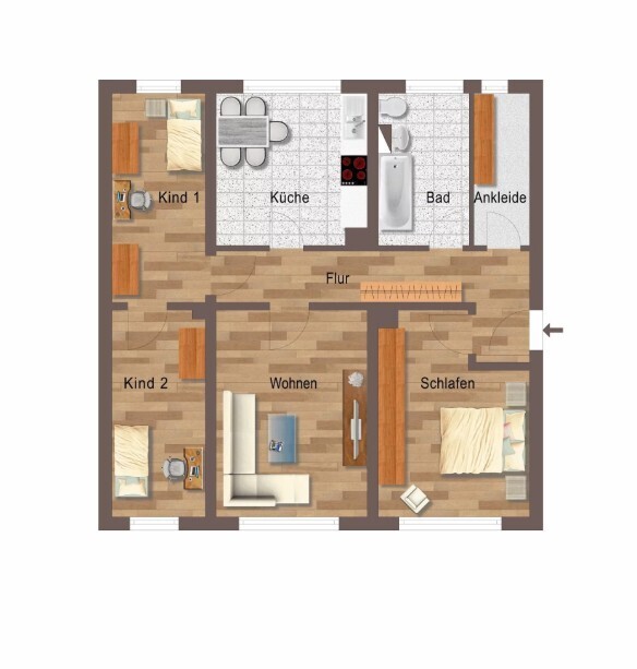 Der helle und moderne Wohnbereich sowie drei weitere Zimmer, bieten vielseitige Nutzungsmöglichkeiten, sei es als Schlafzimmer, gemütliches Homeoffice oder Gästezimmer. Ein besonderes Highlight ist die praktische Ankleide, die zusätzlichen Stauraum schafft und für Ordnung sorgt. Die separate Küche ermöglicht eine angenehme Trennung von Wohn- und Küchenbereich, während das freundliche Tageslichtbad mit Dusche zum Entspannen einlädt.