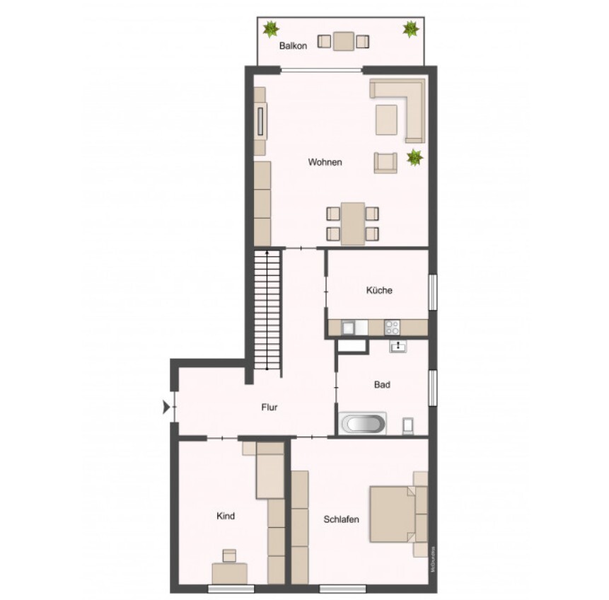 Die Raumaufteilung umfasst vier Wohnräume, eine Küche, ein Tageslichtbad mit Wanne sowie einem Balkon. Ein besonderes Highlight ist der wunderschöne Garten, der zur Wohnung gehört.